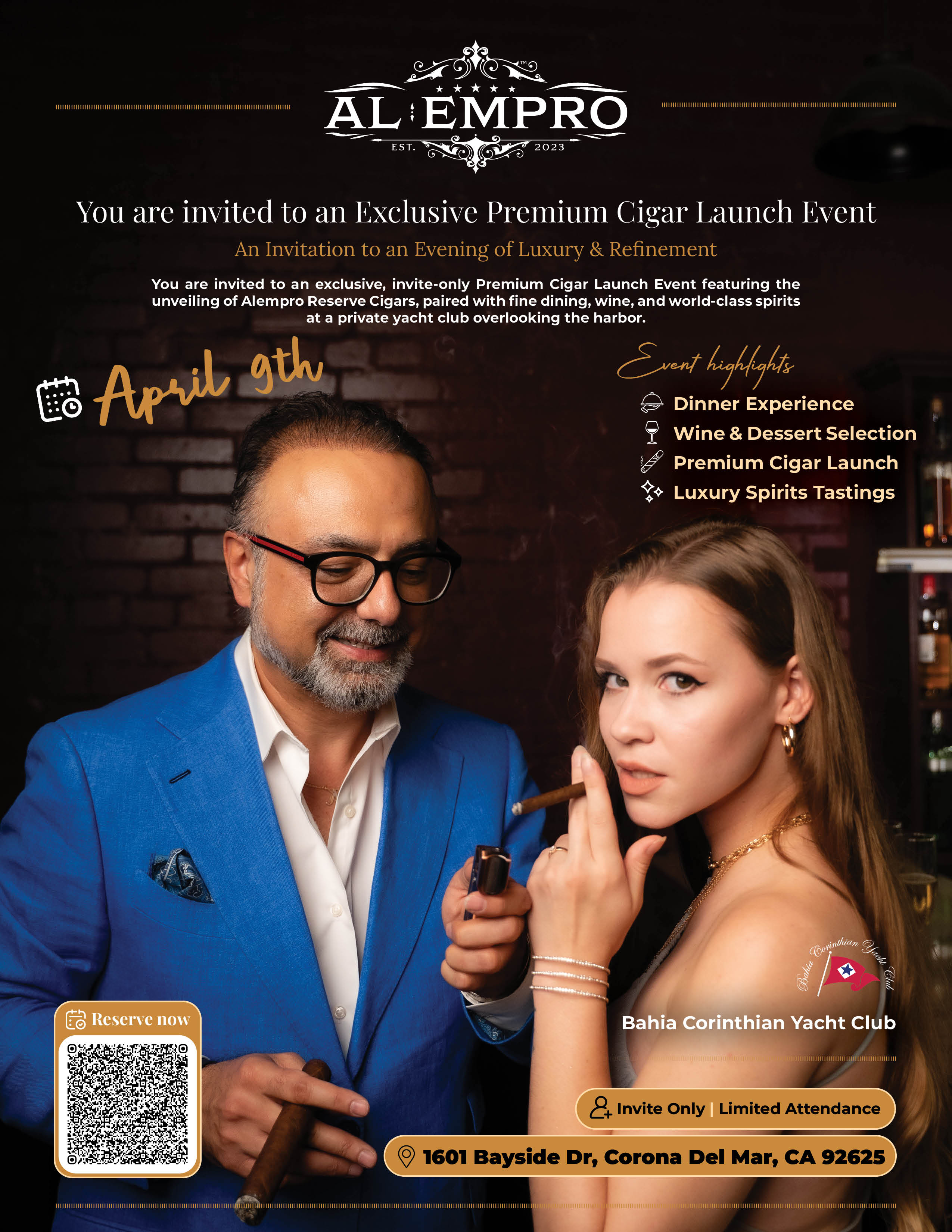 An invite-only evening of luxury and refinement, featuring the official unveiling of Alempro Reserve Cigars. Hosted at the prestigious Bahia Corinthian Yacht Club overlooking the harbor, guests enjoyed a curated dinner experience, wine and dessert selections, and luxury spirits tastings in an intimate setting.